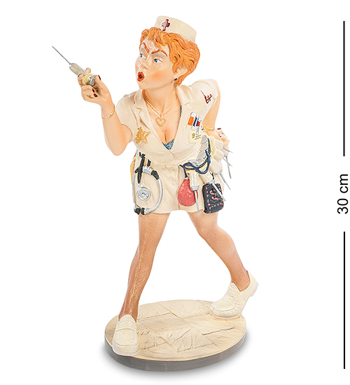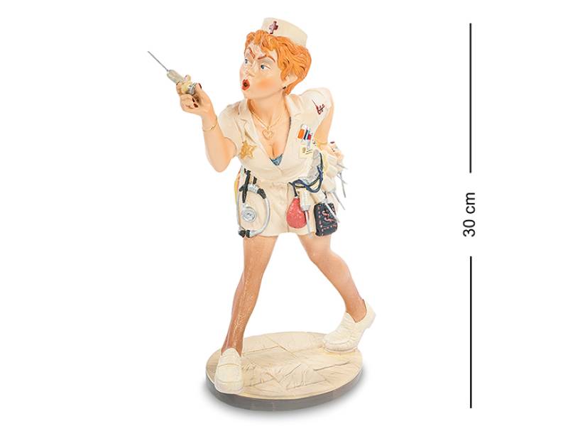 Оригинальная статуэтка «Медсестра» создана дарить хорошее настроение. Её образ полностью соответствует тем девушкам, которые на фоне привычного белого халата, могут выглядеть привлекательно, соблазняя не только пациентов кругом, но и коллег по работе. Яркий образ представлен голубоглазой девушкой, собирающейся сделать очередной укол пациенту. Фигурка выполнена из полистоуна, где четко передано выражение лица медсестры.
