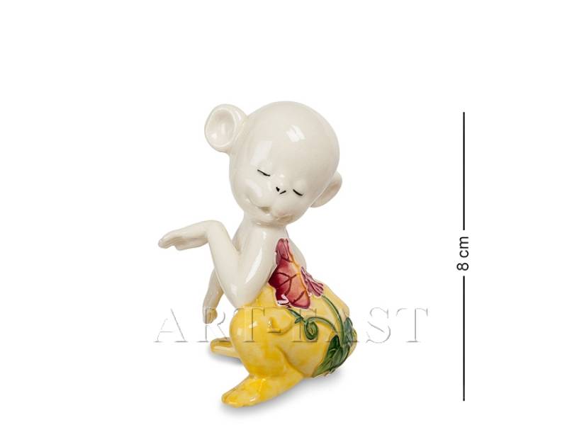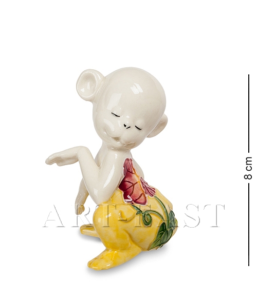 Милую фарфоровую обезьянку невозможно недооценить, она так мило улыбается, отвернув голову в сторону, что сразу возникают мысли о том, что означает это странный жест? Красивая фигурка создана дарить радость, она декорирована крупными яркими цветами, которые изящно покрывают её. Позитивный образ заставляет задуматься о чем-то необычном.