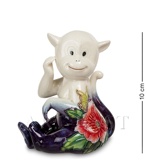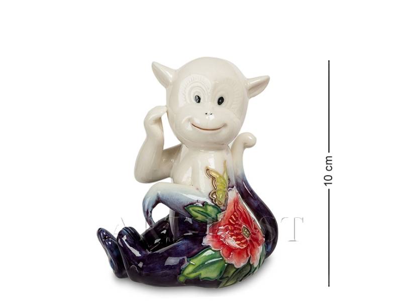 При взгляде на эту милую статуэтку обезьянки, вырисовываются только приятные слова: «Какая красота!» И действительно, мастера потрудились создать необычный силуэт, в котором сочетаются темно-синяя и белая цветовая гамма. Она усыпана роскошными большими цветами, которые украшают её. Обезьянка задумчиво смотрит и улыбается, словно её отвлекли от какого-то дела.