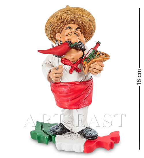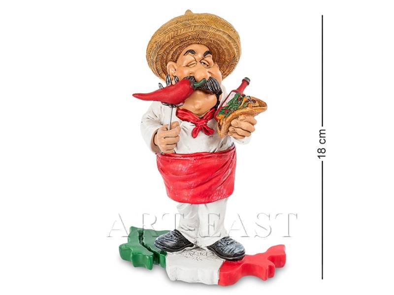 Фигурка шеф-повара мексиканской кухни высотой 18 см. Острый и яркий, как перец чили, повар-мексиканец станет замечательным украшением кафе/ ресторана в мексиканском стиле или отличным подарком всем поклонникам буррито, такос и кесадильи. Не только характерным вкусом и пикантной остротой отличается мексиканская кухня от остальных. Главным отличием является тот факт, что она была внесена в список всемирного культурного наследия ЮНЕСКО в 2010 году.
