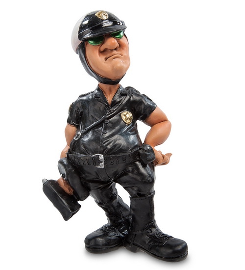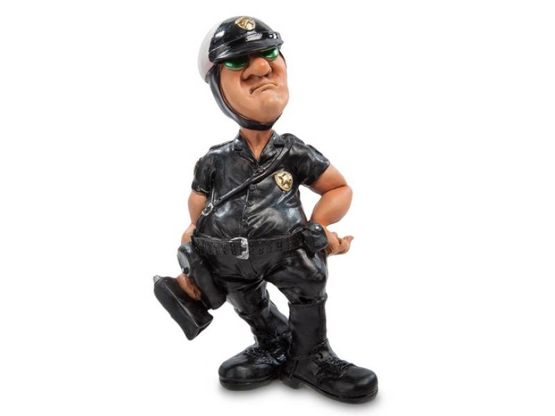 Прикольная фигурка полицейского - доблестный полицейский вовсе не занимается ловлей преступников и борьбой с хулиганами. Его основная задача – порядок на дорогах. Первый признак – радар, который блюститель порядка уверенно сжимает в руке: это его основное оружие. На голове – шлем: а вдруг нарушитель надумает скрыться, и за ним придется гнаться на мотоцикле.