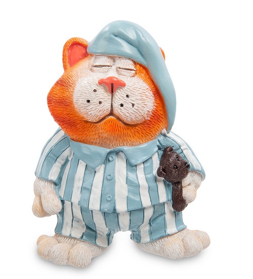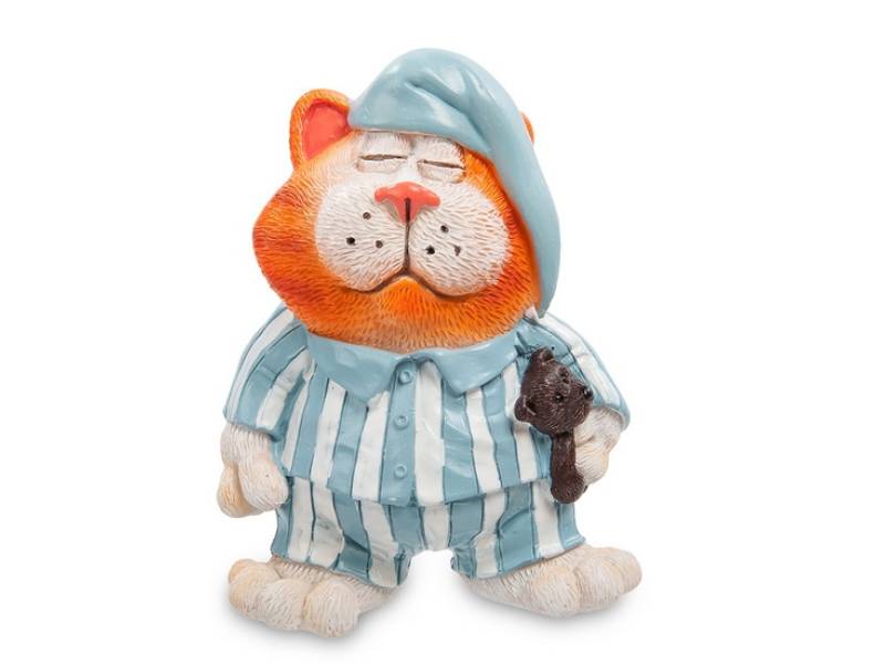 Статуэтка кота - вот и вечер наступил, пора спать ложиться. Рыжий кот приготовился ко сну по всем правилам – пижаму надел, ночной колпак на голову, куклу-медвежонка с собой прихватил – молодой еще котенок, без куклы засыпать не привык. Глаза закрыл и полностью расслабился. Но, как говорится, держит ушки на макушке.